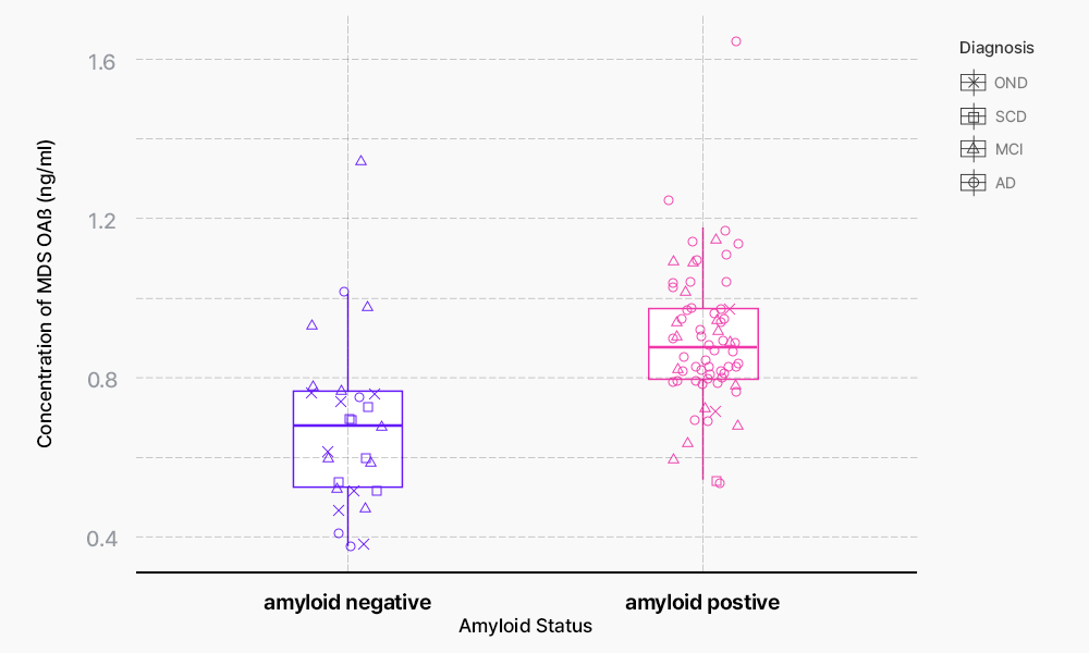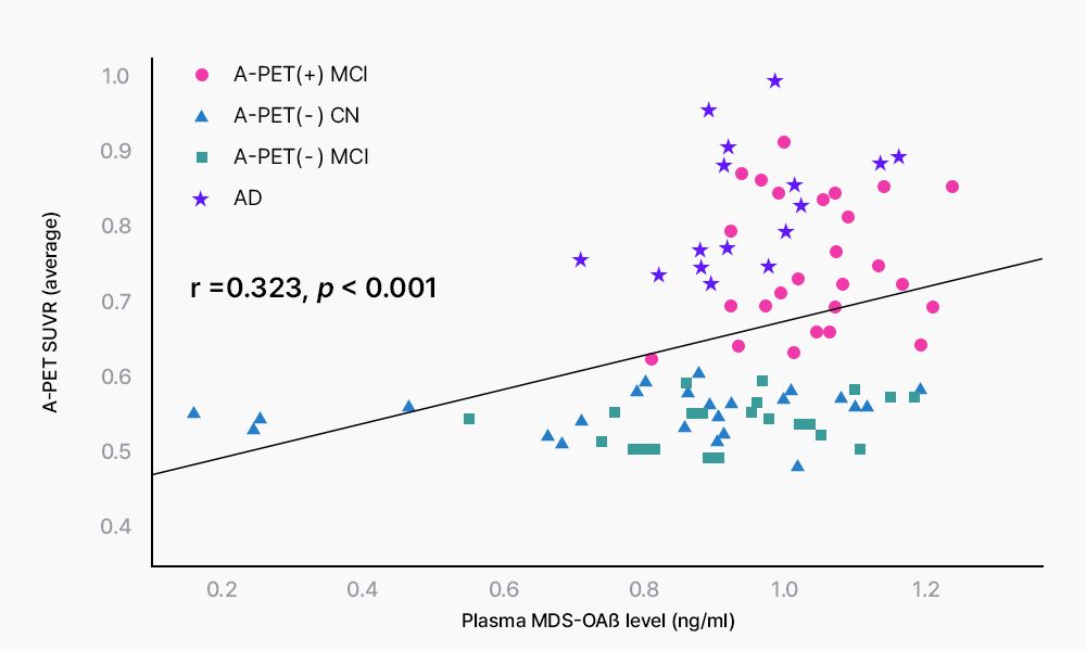 ∴ MDS-OAβ 측정값과 뇌 PET 스캔을 통해 측정한 아밀로이드 베타 축적량(SUVR) 간의 상관관계를 분석한 결과MDS-OAβ 레벨은 뇌내 Aβ 축적량과 양의 상관관계를 보여주었다