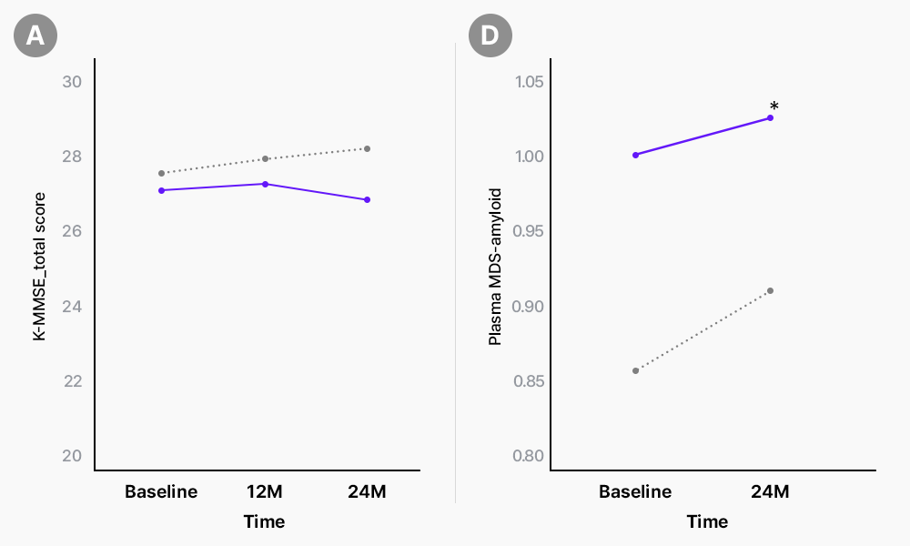 ∴ 아밀로이드 침착 여부에 따라 인지 기능 및 바이오마커를 추적 관찰하였고, 연구 개시 24개월 후, 전반적 인지기능을 나타내는 K-MMSE score는 아밀로이드 축적 여부에 따라 변하지 않았지만(그림A) 아밀로이드 침착 양성 SCD 군에서 혈장 아밀로이드 베타값은 높게 나타났다(그림 D).